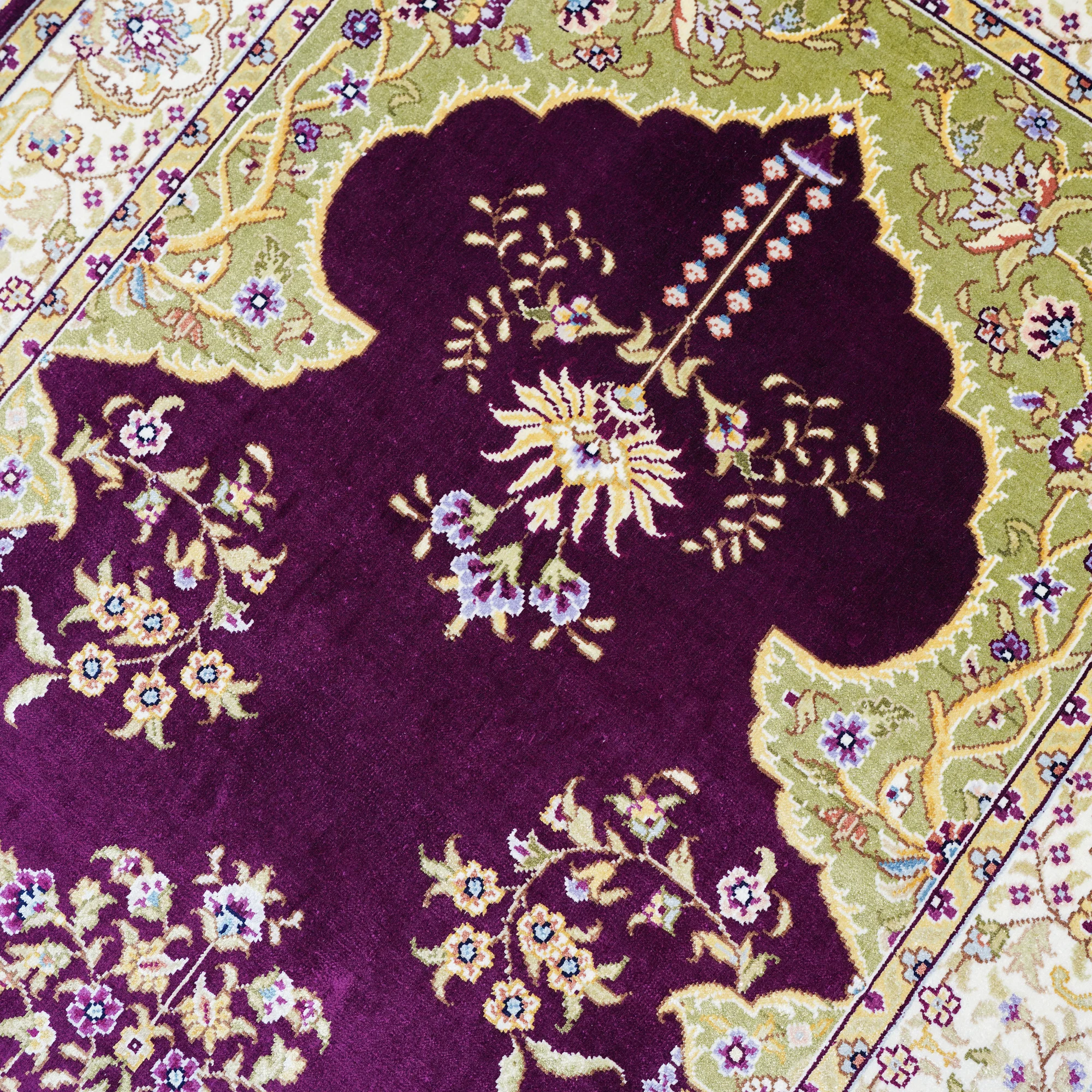 At the heart of the rug lies its rich crimson field—an opulent shade chosen to evoke warmth, serenity, and spiritual grounding. This deep wine-red background creates an immediate visual impact, drawing the eye toward the intricate detailing woven throughout the design. Central to the rug is its mihrab-inspired arch motif, a traditional element symbolizing direction, reflection, and elevated purpose. The arch is framed by cascading floral vines, delicate arabesques, and softly curving tendrils that emulate the flowing beauty of classical Persian gardens.