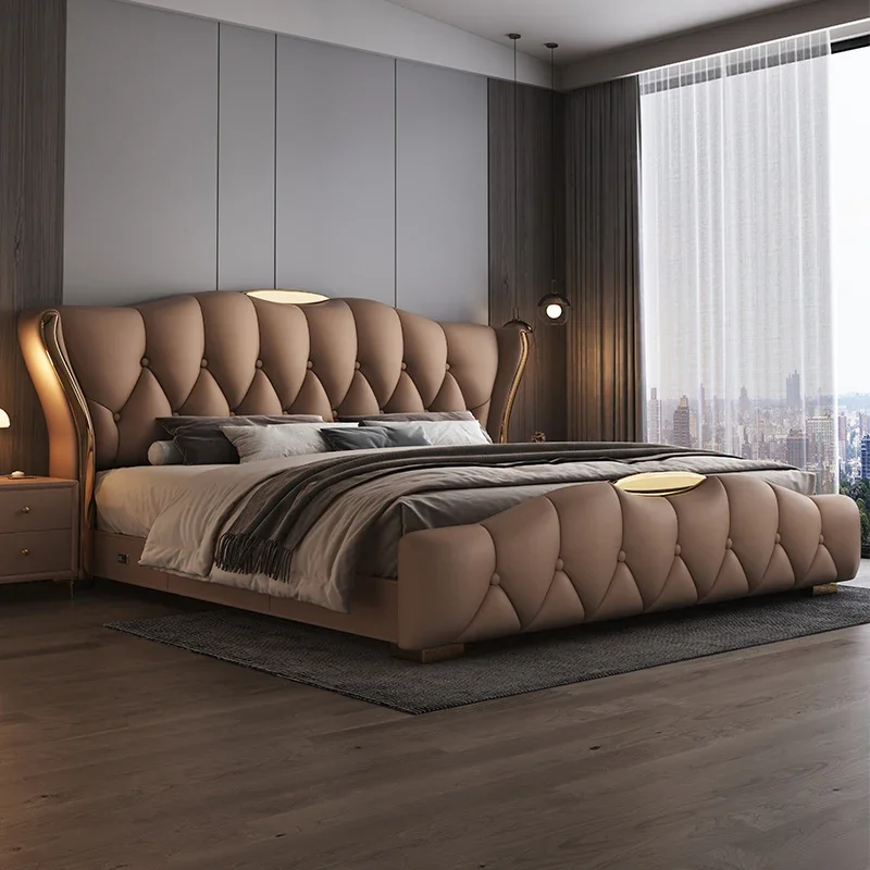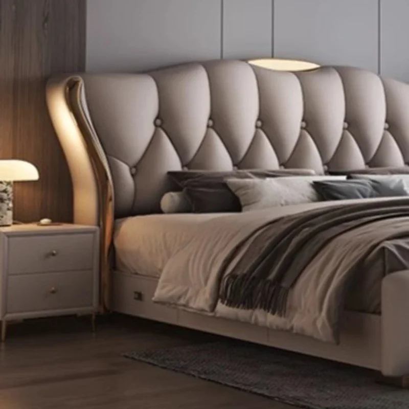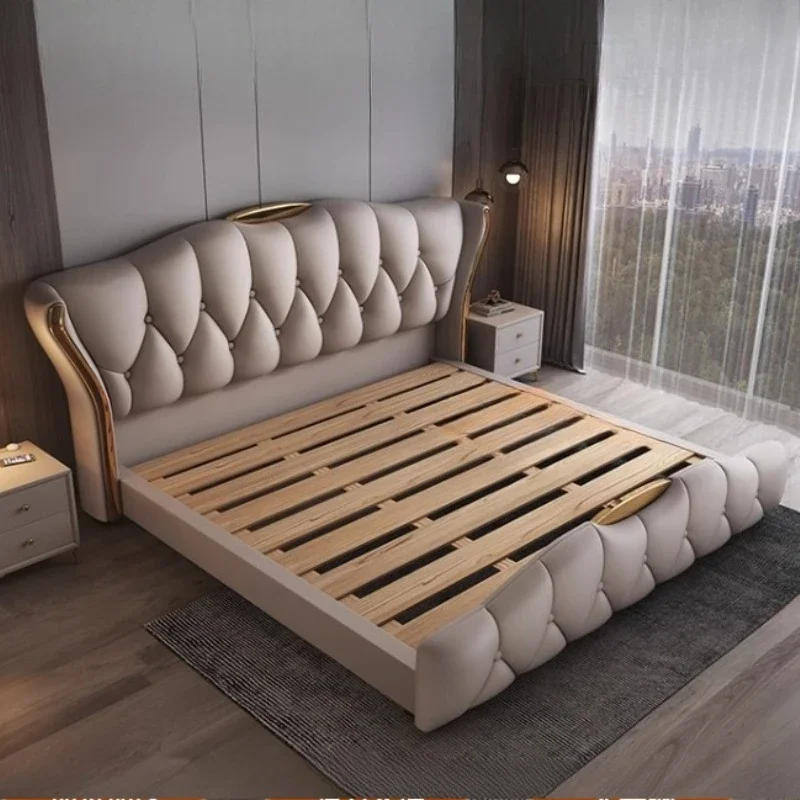 Bedroom Furniture Modern Leather Double Bed Headboard Frame Cama De Casal King Bed 150X200 Wood Shelve Luxury Modern