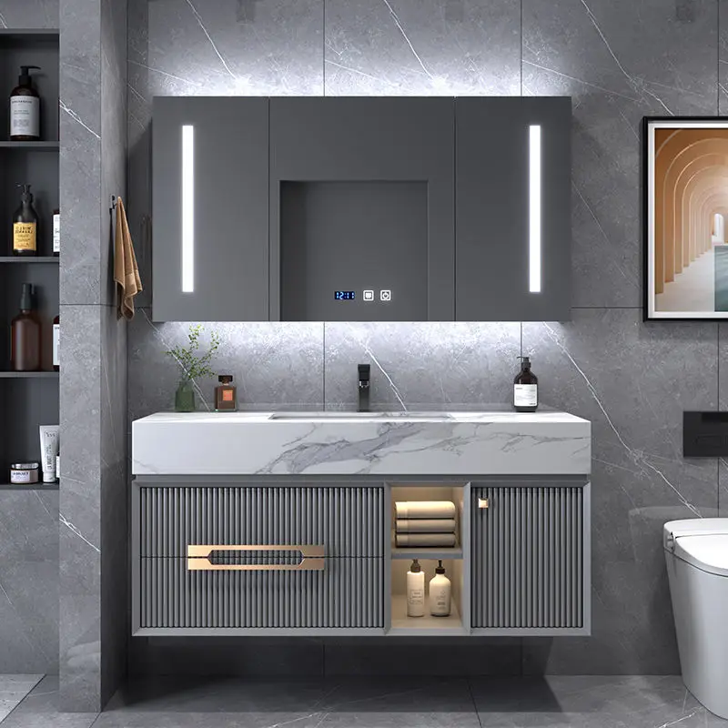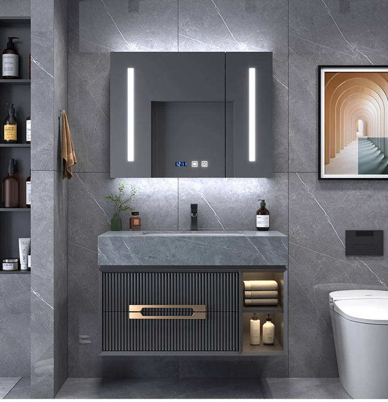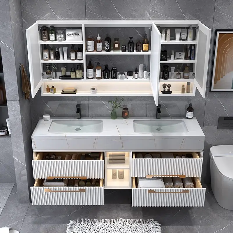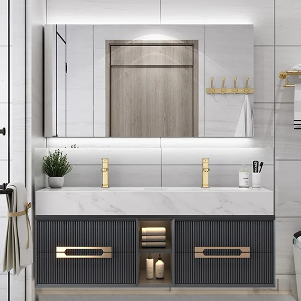 Function and design were developed hand-in-hand. The vanity’s wide countertop provides ample workspace and features two gently contoured, rectangular basins integrated seamlessly into the surface for a minimalist, grout-free finish that’s easy to clean. A recessed central open cubby offers convenient, visible storage for rolled towels or display items, while two flanking soft-close drawers keep toiletries and daily essentials neatly stowed. The wall-mounted design lifts the cabinet off the floor to create an airy visual plane and makes bathroom cleaning effortless. The included full-width LED mirror cabinet illuminates the space evenly with hidden backlighting and an under-mirror ambient LED strip, producing flattering, shadow-free light ideal for grooming.