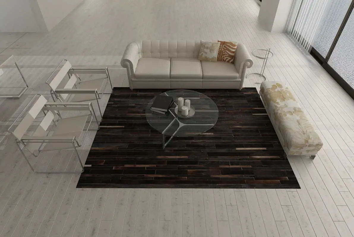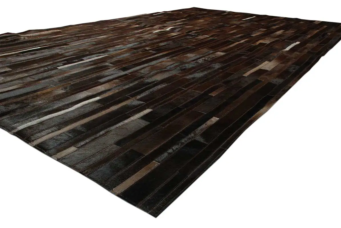 The TimberStrip™ Luxe Cowhide Rug transforms natural hide into a contemporary masterpiece — a long, linear patchwork that reads like reclaimed wood flooring but with the warmth and tactile luxury of genuine leather. Crafted from premium cowhide offcuts, each rug is assembled from narrow, elongated strips that are hand-selected for tone and grain, then stitched together to create a continuous field of rich, multi-dimensional brown. The resulting surface has an organic, variegated look: deep espresso and chocolate tones sit next to lighter caramel and mahogany highlights, producing an elegant striation that shifts with the light and movement in the room.